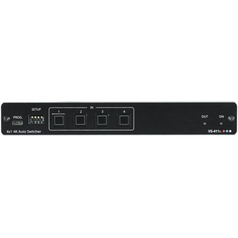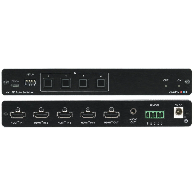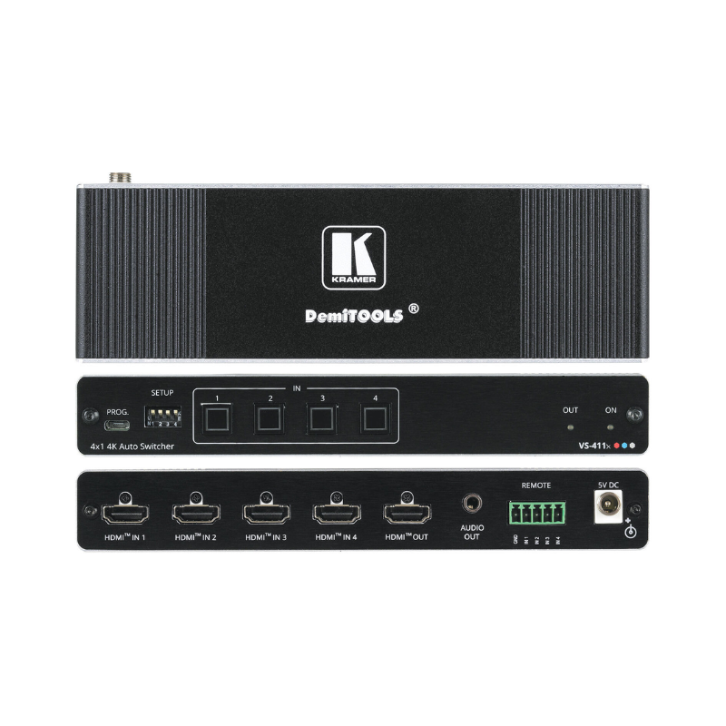 VS−411X is a high−performance 4×1 automatic switcher for 4K HDR, HDMI video signals. Offering priority and last−connected switching options, it automatically switches according to the selected switching scheme based on active video signal detection.